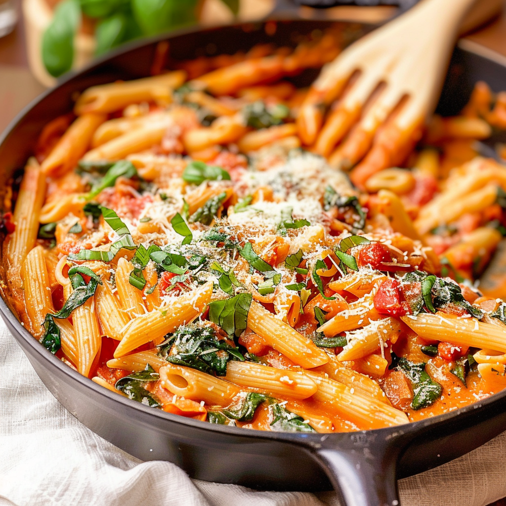 20-Minute Creamy Tomato Basil Penne with Spinach Delight
