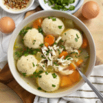 Matzah Ball Soup (with shredded chicken) is a comforting Jewish dish featuring fluffy matzah balls floating in rich chicken broth, often accompanied by tender pieces of shredded chicken. This soup is not just food; it’s tradition served warm with love.