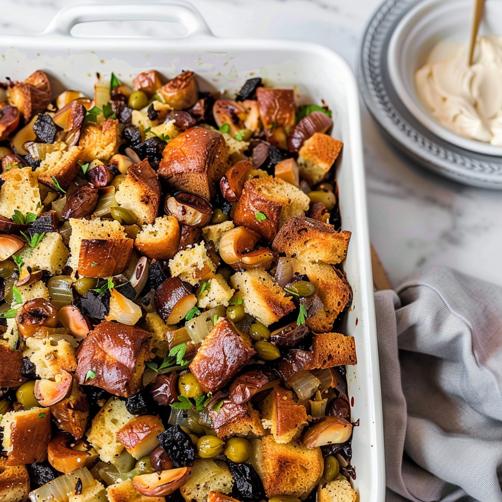 Start by roasting the chestnuts while you prepare the aromatics. Sauté onions and celery in butter, then mix in the herbs. Combine everything with the bread cubes and broth, ensuring even moisture for the best texture and flavor.